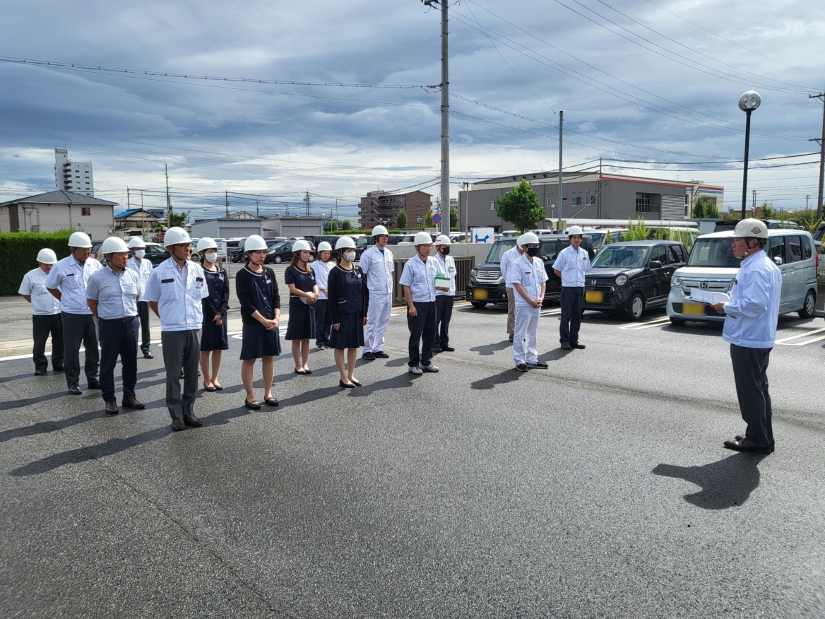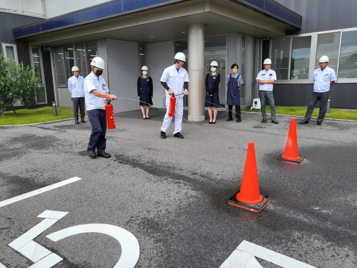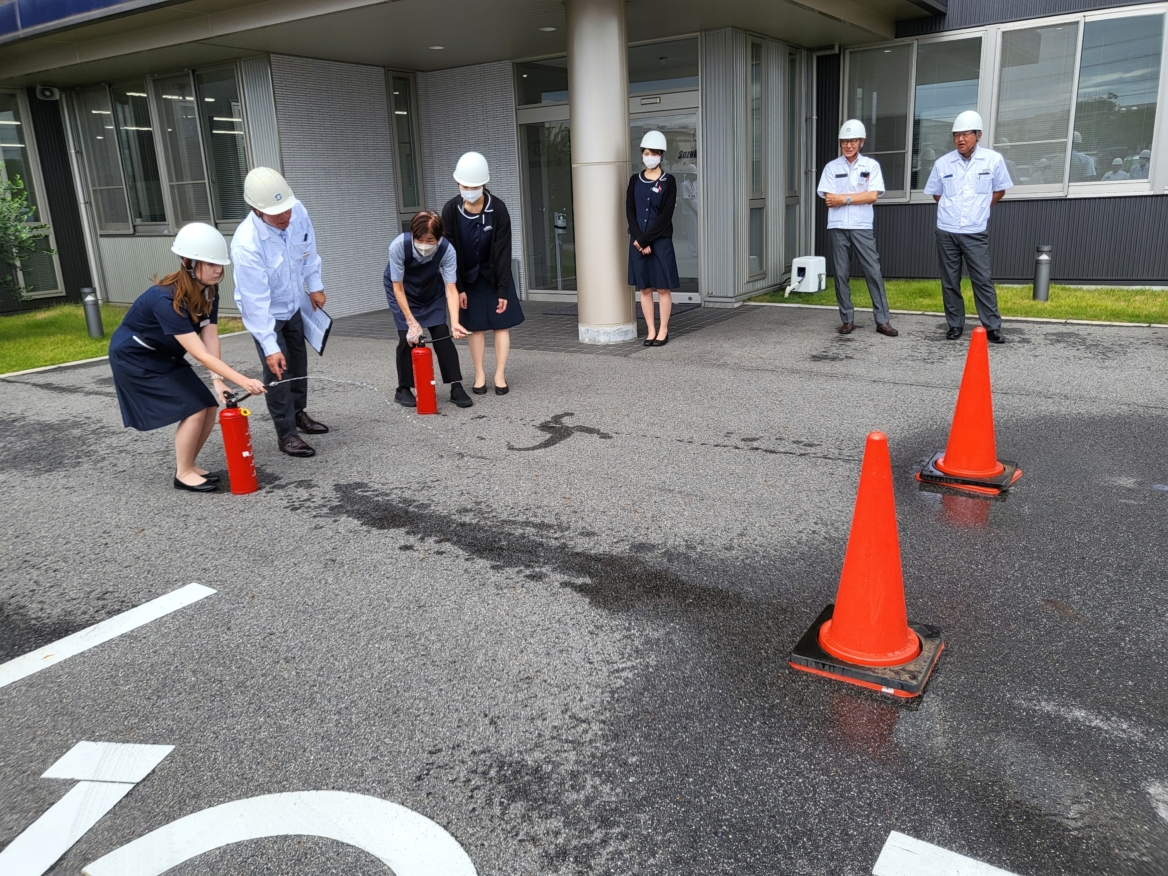 避難訓練は年2回実施。避難完了の点呼後に、消火器の使い方を訓練しました。